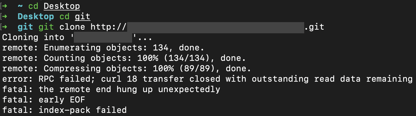 git clone을 받으려고 하는데 "RPC failed; curl 18 transfer closed with outstanding read data remaining" 라는 문구가 뜨면서 클론이 안 되고 있다.