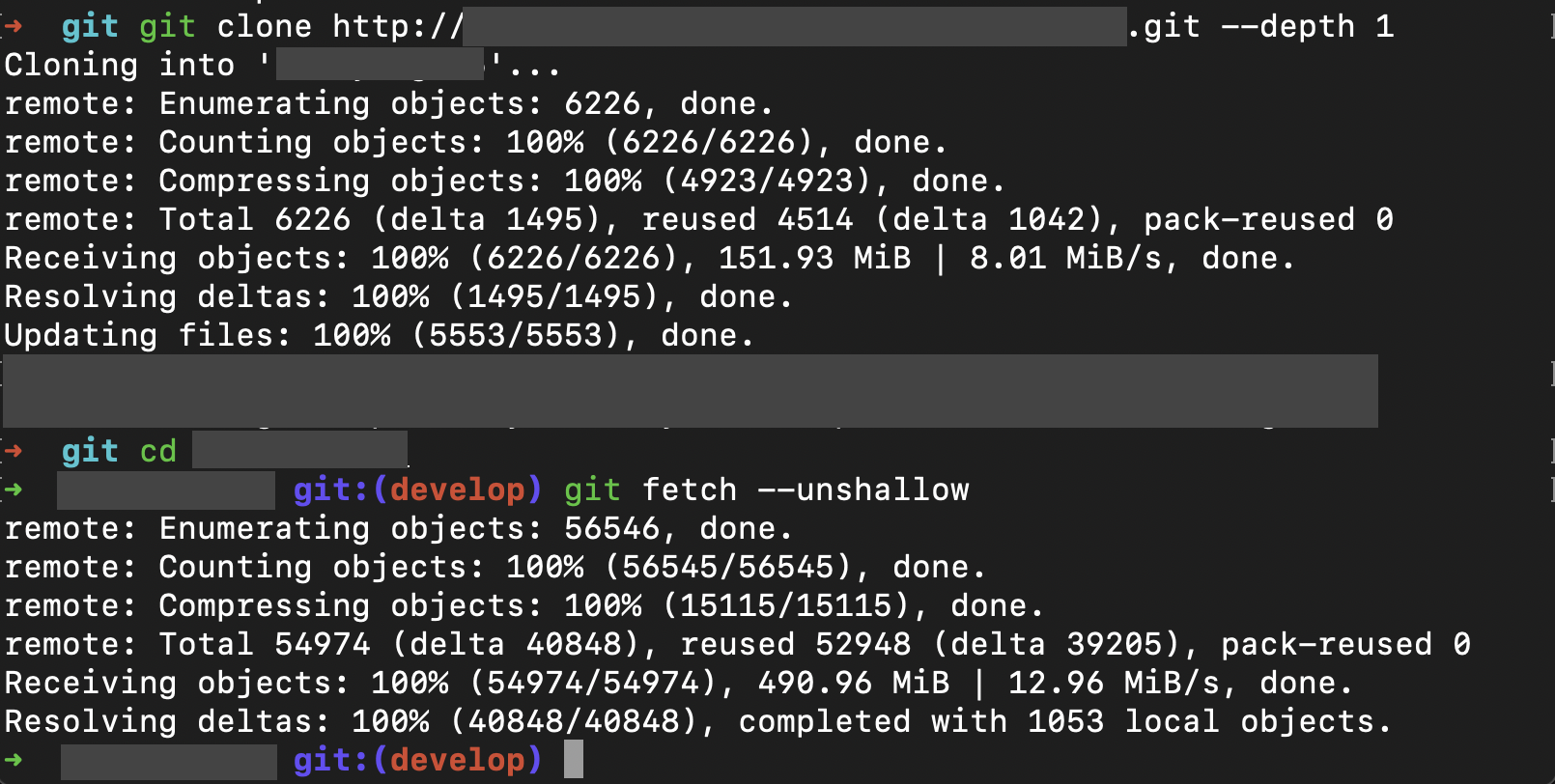 먼저 얕은 클론을 한 후(--depth 1) -> 점진적으로 레포를 가져온다(fetch --unshallow)