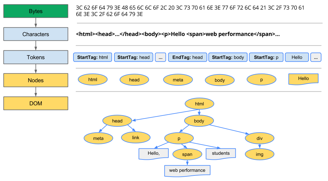 - 변환: 만약 위와 같은 단순한 HTML 코드가 있다고 가정한다면, 렌더링 엔진은 HTML의 원시 바이트를 디스크나 네트워크에서 읽어와서, 해당 파일에 대해 지정된 인코딩(UTF-8 등)에 따라 개별 문자로 변환한다.