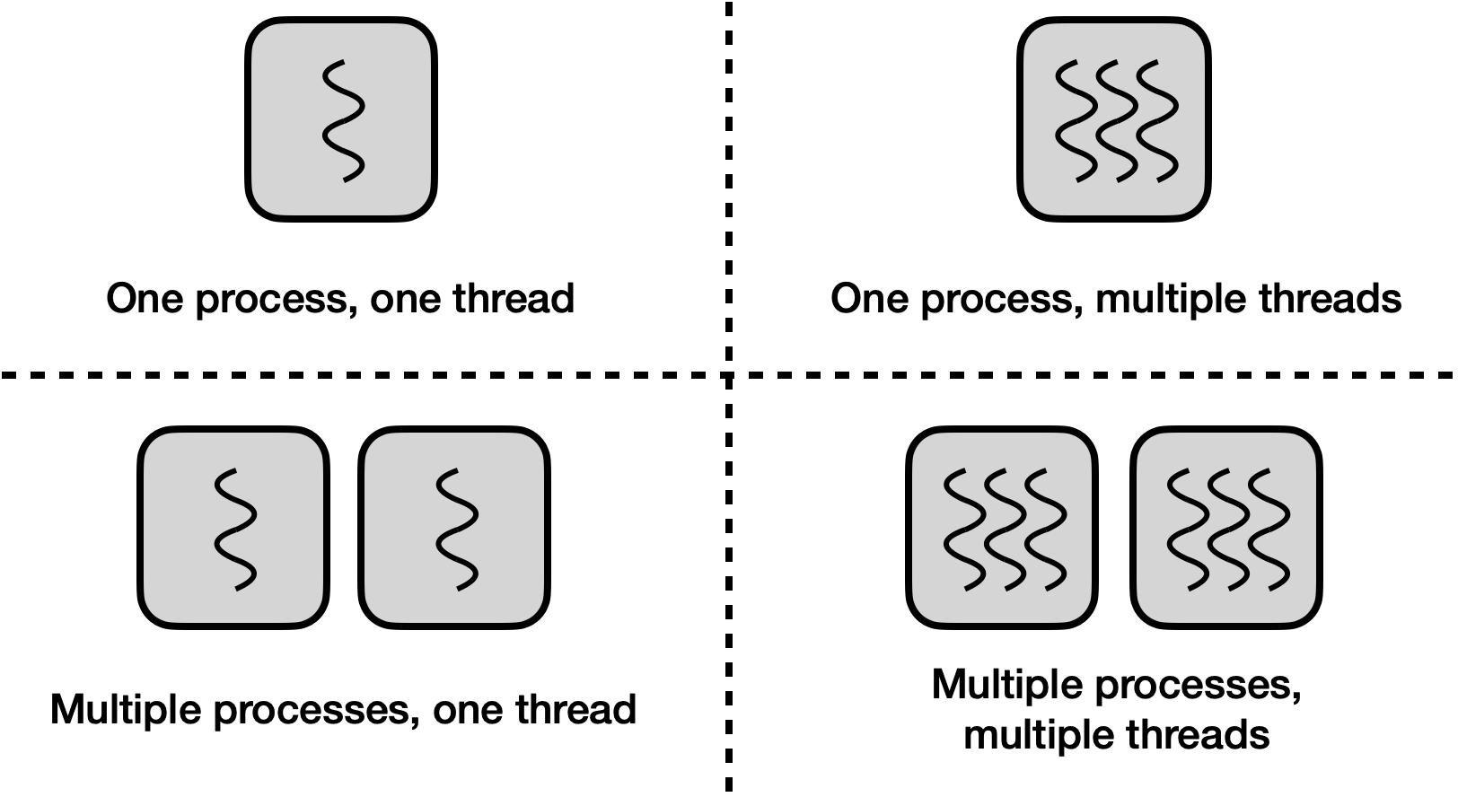 이전 글에서는 초기 컴퓨터에서처럼 CPU가 1개인 경우를 가정하고 정리해 봤는데 최근에는 가성비 노트북도 기본으로 멀티코어, 쿼드코어를 탑재하고 있기 때문에 멀티 프로세싱이 가능하다. 이전까지 1개의 CPU가 여러 개의 프로세스를 번갈아가며 수행하는 것을 '멀티 태스킹'이라고 하고, 최신 컴퓨터에서처럼 CPU가 여러 개 있는 환경에서는 여러 CPU가 여러 개의 프로세스를 협력해서 수행하는 것을 '멀티 프로세싱'이라고 한다. 멀티 프로세싱이 가능한 건 스레드를 여러 개 만들면 가능하다. 이를 그림으로 나타내면 다음과 같다.