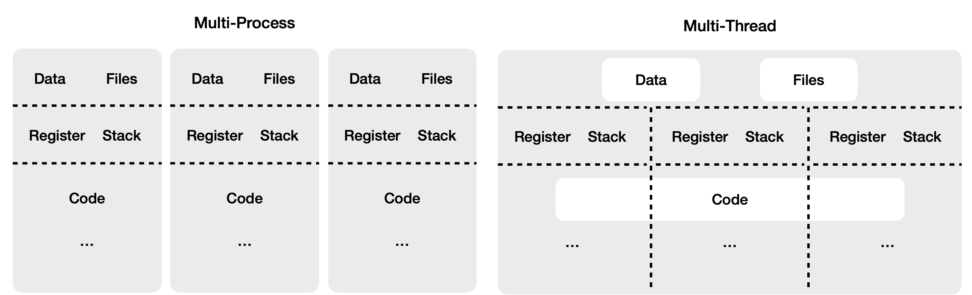 앞서 프로세스의 구조를 정리한 글에서처럼 프로세스에는 data, files, 레지스터, 스택, 코드 등이 구성돼 있다. 스레드도 프로그램을 실행하기 위해 각각의 요소가 필요하다. 그럼 프로세스가 여러 개 있는 멀티 프로세스와, 스레드가 여러 개 있는 멀티 스레드는 어떻게 다른지 모식도로 나타내 보았다.