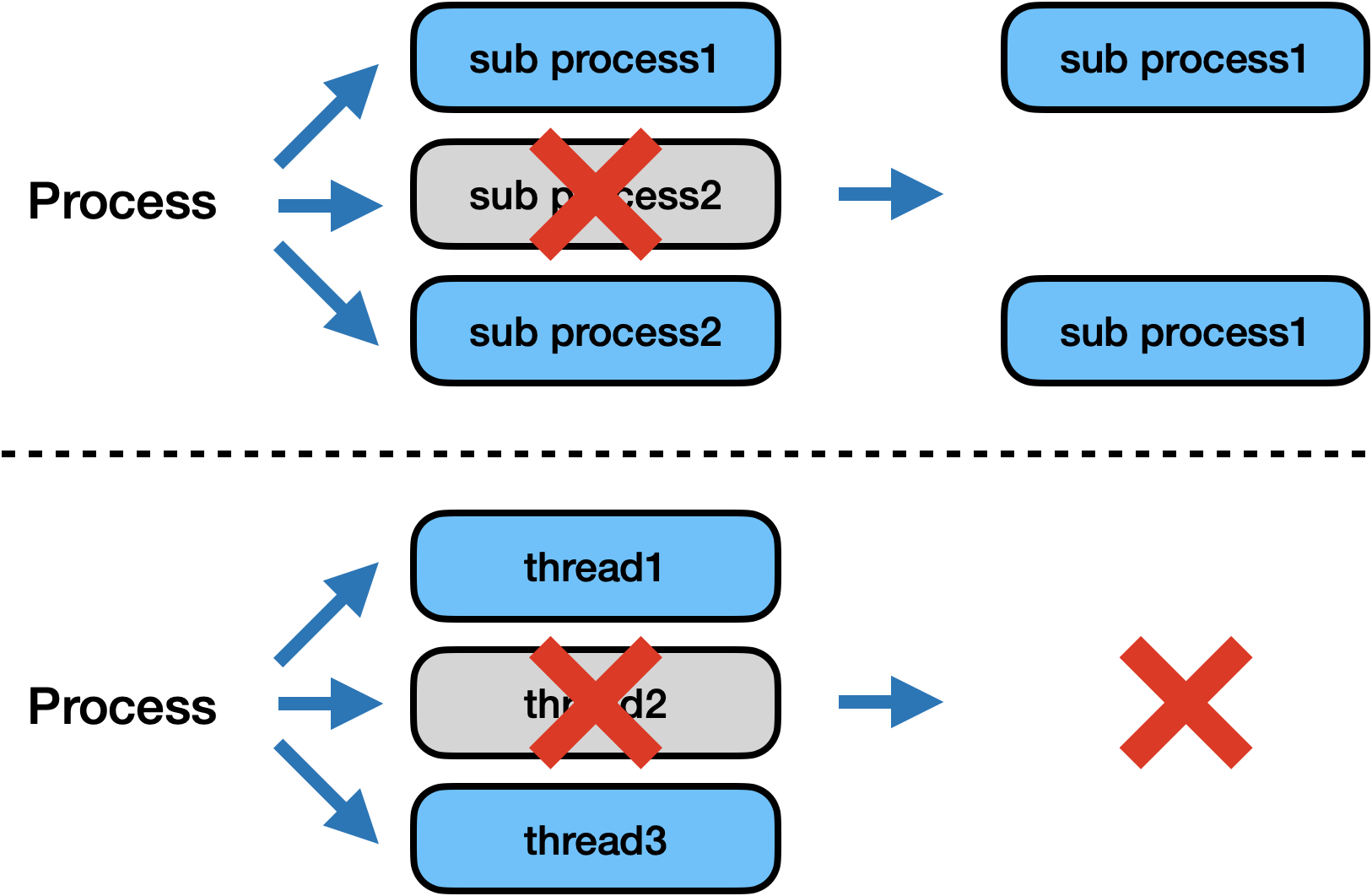 멀티 프로세스의 경우, 한 프로세스에 문제가 생겨도 다른 프로세스의 실행에는 영향이 없다.